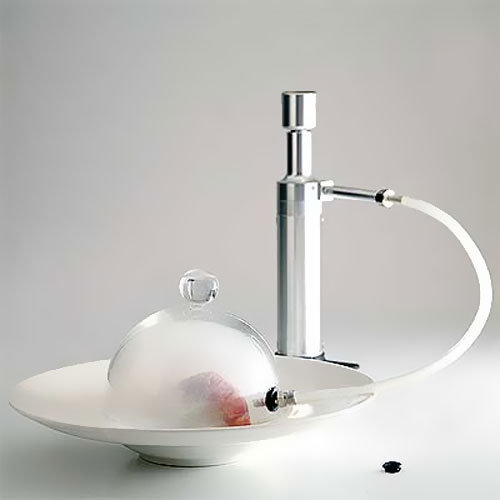 De plus la fumée est rejetée sous pression ce qui permet de contrôler son application avec précision ou de l’enfermer dans des cloches transparentes pour un effet optique et gustatif en salle.