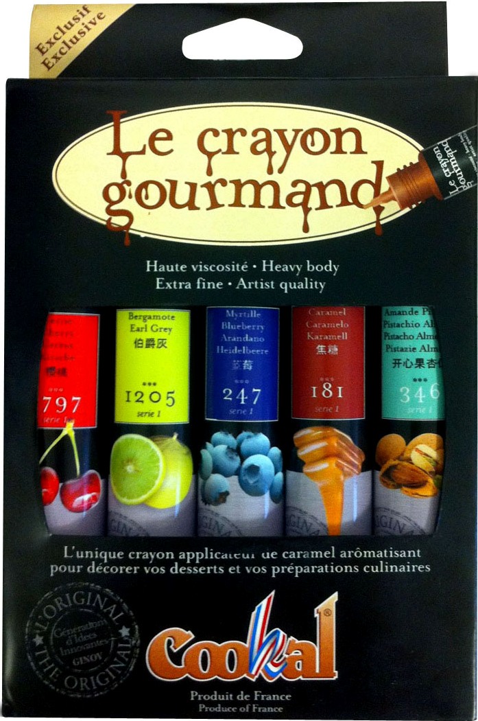 Laissez parler votre créativité grâce à cette gamme de crayons "gourmands" de caramel liquide aromatisé COOKAL Le lot comporte 5 parfums : Bergamote, caramel, myrtille, pistache et cerise Spécialement étudiés pour facilité la réalisation d'écriture gourmande et des décors d’assiettes, qui se dégustent. Pour la décoration de vos assiettes et mets ou pour le nappage. L'écriture qui se déguste et qui sublime vos mises en scène !