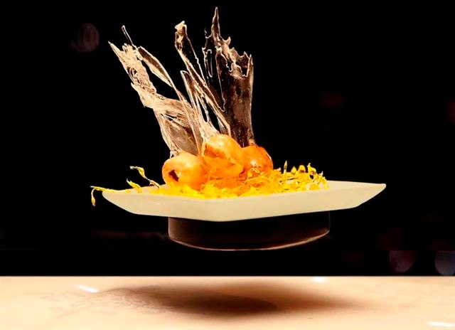 Système de mise en lévitation par électromagnétisme permettant de soulever jusqu’à 350 g. Composé d’un plateau magnétique sur batterie, qui sert de base. Puis un 2ème socle magnétique plus petit, qui « flotte » en lévitation au dessus du premier, et qui sert de support aux assiettes, verres, plateaux, etc… que l’on peut poser dessus et qui seront ainsi en lévitation.